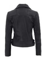 The jacket’s sleek silhouette is enhanced by silver hardware accents that instantly bring a polished and stylish finish. The detailed stitching and textured patterning on the arms and shoulders create visual intrigue, giving the jacket more depth and character. Its turn down collar and front zipper closure maintain the authentic biker aesthetic, while the classic black color makes it easy to pair with jeans, dresses, or boots.